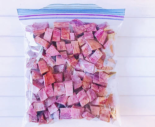 煮粥或者煮飯時加幾塊紫薯進(jìn)去味道會更加好吃,但通用我們一次不會用到一大顆紫薯,因此剩下的紫薯要切塊放冷…